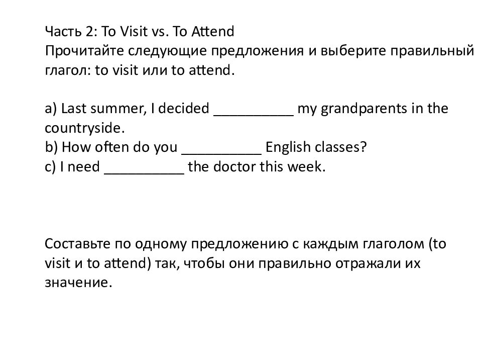 Часть 2: To Visit vs. To Attend Прочитайте следующие предложения и выберите правильный глагол: to visit или to attend. a) Last summer, I decided __________ my grandparents in the countryside. b) How often do you __________ English classes? c) I need __________ the doctor this week. Составьте по одному предложению с каждым глаголом ( to visit и to attend) так, чтобы они правильно отражали их значение.