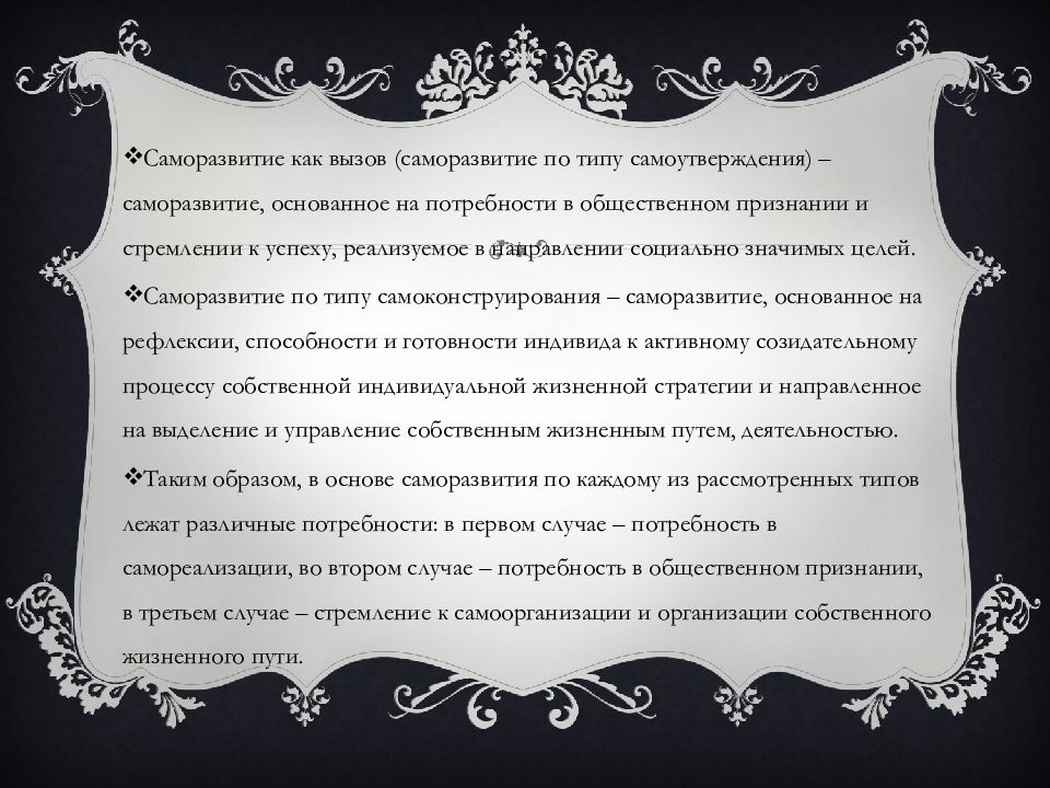 Саморазвитие как вызов (саморазвитие по типу самоутверждения) – саморазвитие, основанное на потребности в общественном признании и стремлении к успеху, реализуемое в направлении социально значимых целей. Саморазвитие по типу самоконструирования – саморазвитие, основанное на рефлексии, способности и готовности индивида к активному созидательному процессу собственной индивидуальной жизненной стратегии и направленное на выделение и управление собственным жизненным путем, деятельностью. Таким образом, в основе саморазвития по каждому из рассмотренных типов лежат различные потребности: в первом случае – потребность в самореализации, во втором случае – потребность в общественном признании, в третьем случае – стремление к самоорганизации и организации собственного жизненного пути.