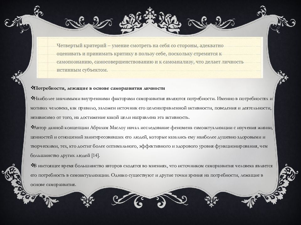 Потребности, лежащие в основе саморазвития личности Наиболее значимыми внутренними факторами саморазвития являются потребности. Именно в потребностях и мотивах человека, как правило, заложен источник его целенаправленной активности, поведения и деятельности, независимо от того, на достижение какой цели направлена эта активность. Автор данной концепции Абрахам Маслоу начал исследование феномена самоактуализации с изучения жизни, ценностей и отношений заинтересовавших его людей, которые казались ему наиболее душевно здоровыми и творческими, тех, кто достиг более оптимального, эффективного и здорового уровня функционирования, чем большинство других людей [14]. В настоящее время большинство авторов сходятся во мнениях, что источником саморазвития человека является его потребность в самоактуализации. Однако существуют и другие точки зрения на потребности, лежащие в основе саморазвития.