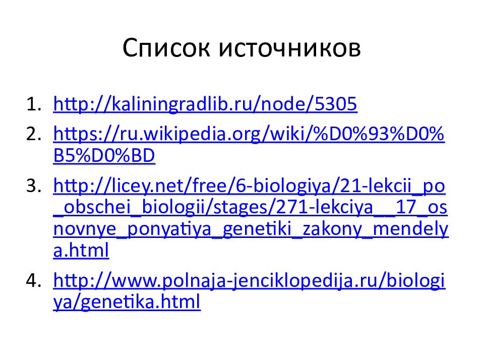 http://kaliningradlib.ru/node/5305 https://ru.wikipedia.org/wiki/%D0%93%D0%B5%D0%BD http://licey.net/free/6-biologiya/21-lekcii_po_obschei_biologii/stages/271-lekciya__17_osnovnye_ponyatiya_genetiki_zakony_mendelya.html http://www.polnaja-jenciklopedija.ru/biologiya/genetika.html