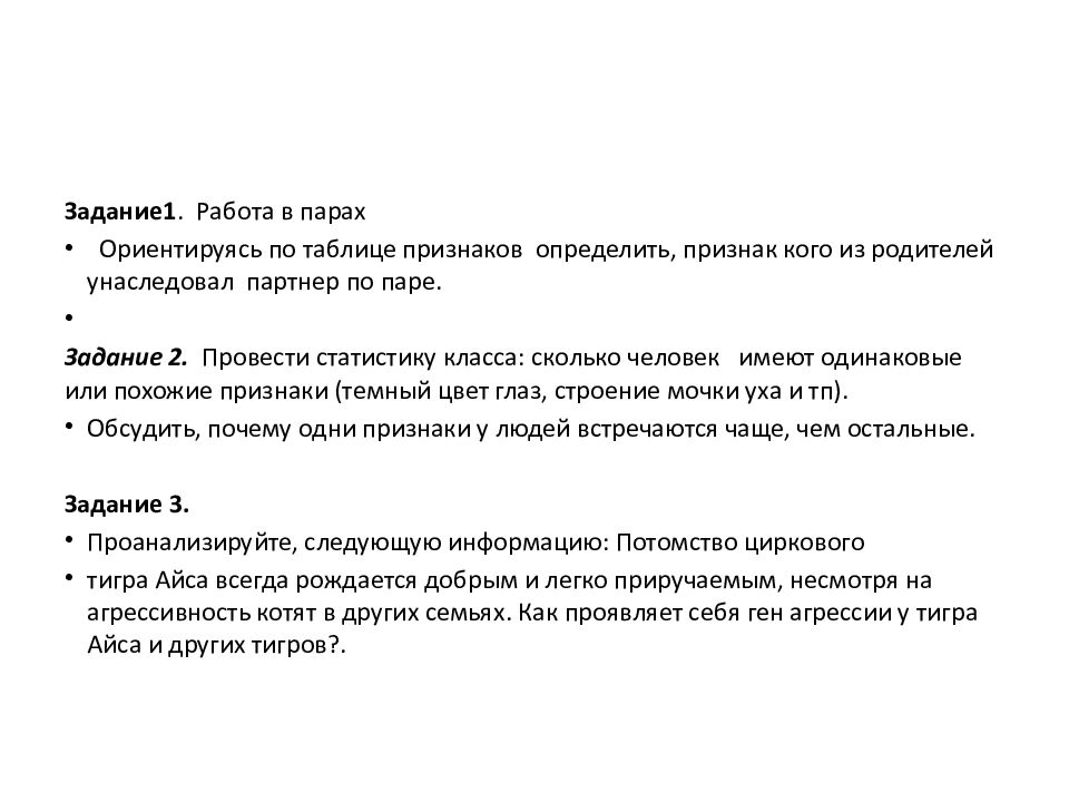 Задание1. Работа в парах Ориентируясь по таблице признаков определить, признак кого из родителей унаследовал партнер по паре. Задание 2. Провести статистику класса: сколько человек имеют одинаковые или похожие признаки (темный цвет глаз, строение мочки уха и тп ). Обсудить, почему одни признаки у людей встречаются чаще, чем остальные. Задание 3. Проанализируйте, следующую информацию: Потомство циркового тигра Айса всегда рождается добрым и легко приручаемым, несмотря на агрессивность котят в других семьях. Как проявляет себя ген агрессии у тигра Айса и других тигров?.