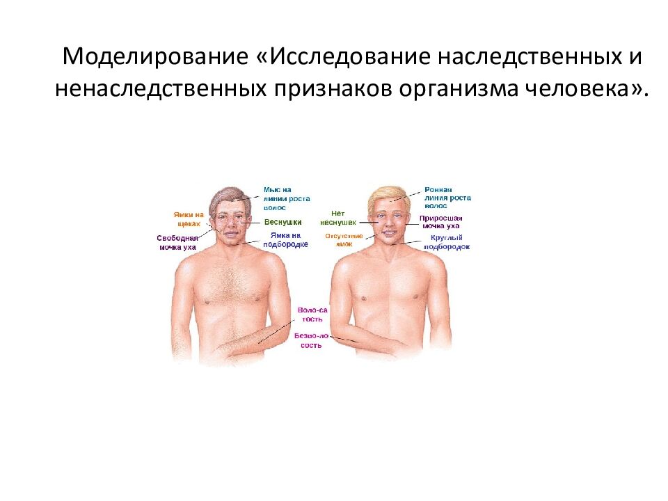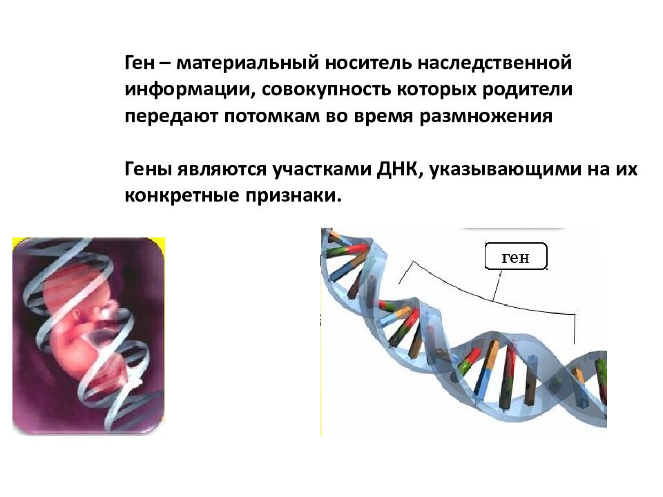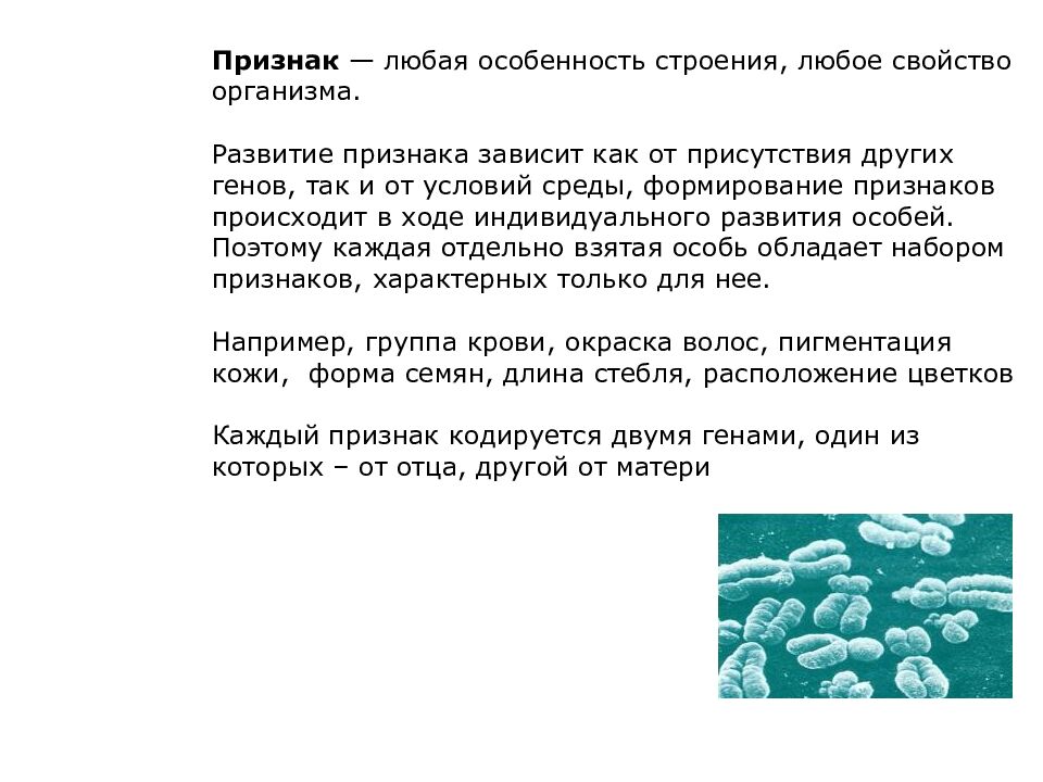Признак — любая особенность строения, любое свойство организма. Развитие признака зависит как от присутствия других генов, так и от условий среды, формирование признаков происходит в ходе индивидуального развития особей. Поэтому каждая отдельно взятая особь обладает набором признаков, характерных только для нее. Например, группа крови, окраска волос, пигментация кожи, форма семян, длина стебля, расположение цветков К аждый признак кодируется двумя генами, один из которых – от отца, другой от матери