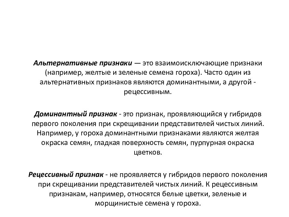 Альтернативные признаки — это взаимоисключающие признаки (например, желтые и зеленые семена гороха). Часто один из альтернативных признаков являются доминантными, а другой - рецессивным. Доминантный признак - это признак, проявляющийся у гибридов первого поколения при скрещивании представителей чистых линий. Например, у гороха доминантными признаками являются желтая окраска семян, гладкая поверхность семян, пурпурная окраска цветков. Рецессивный п ризнак - не проявляется у гибридов первого поколения при скрещивании представителей чистых линий. К рецессивным признакам, например, относятся белые цветки, зеленые и морщинистые семена у гороха.