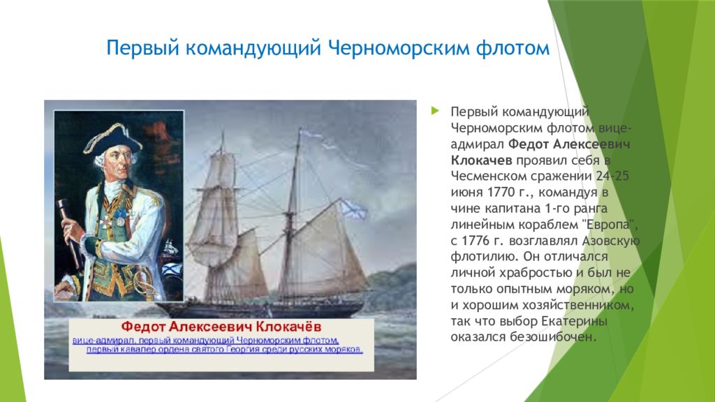 Первый командующий Черноморским флотом вице-адмирал Федот Алексеевич Клокачев проявил себя в Чесменском сражении 24-25 июня 1770 г., командуя в чине капитана 1-го ранга линейным кораблем "Европа", с 1776 г. возглавлял Азовскую флотилию. Он отличался личной храбростью и был не только опытным моряком, но и хорошим хозяйственником, так что выбор Екатерины оказался безошибочен.