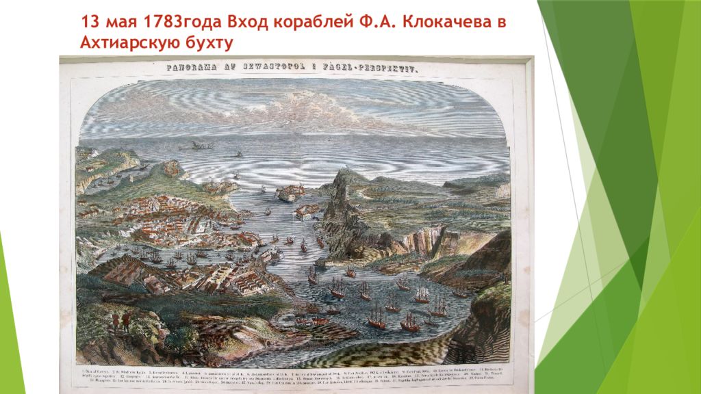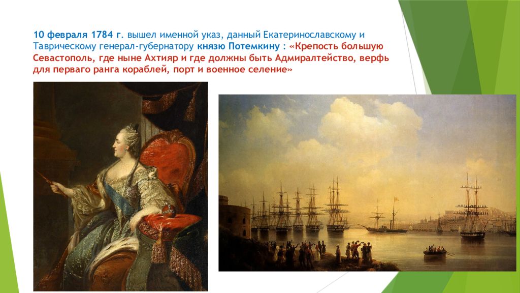 Слайд 5: 10 февраля 1784 г. вышел именной указ, данный Екатеринославскому и Таврическому генерал-губернатору князю Потемкину : «Крепость большую Севастополь, где ныне Ахтияр и где должны быть Адмиралтейство, верфь для перваго ранга кораблей, порт и военное селение»