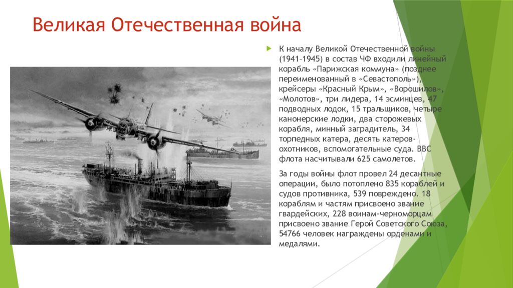 К началу Великой Отечественной войны (1941–1945) в состав ЧФ входили линейный корабль «Парижская коммуна» (позднее переименованный в «Севастополь»), крейсеры «Красный Крым», «Ворошилов», «Молотов», три лидера, 14 эсминцев, 47 подводных лодок, 15 тральщиков, четыре канонерские лодки, два сторожевых корабля, минный заградитель, 34 торпедных катера, десять катеров-охотников, вспомогательные суда. ВВС флота насчитывали 625 самолетов. За годы войны флот провел 24 десантные операции, было потоплено 835 кораблей и судов противника, 539 повреждено. 18 кораблям и частям присвоено звание гвардейских, 228 воинам-черноморцам присвоено звание Герой Советского Союза, 54766 человек награждены орденами и медалями.