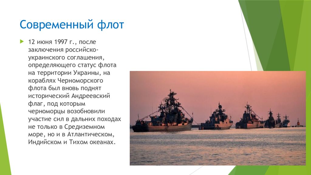 12 июня 1997 г., после заключения российско-украинского соглашения, определяющего статус флота на территории Украины, на кораблях Черноморского флота был вновь поднят исторический Андреевский флаг, под которым черноморцы возобновили участие сил в дальних походах не только в Средиземном море, но и в Атлантическом, Индийском и Тихом океанах.