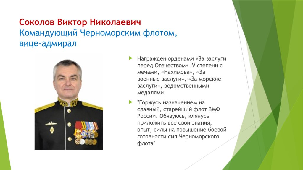 Последний слайд презентации: Черноморский флот: Соколов Виктор Николаевич Командующий Черноморским флотом, вице-адмирал