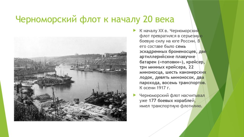 К началу ХХ в. Черноморский флот превратился в серьезную боевую силу на юге России. В его составе было семь эскадренных броненосцев, две артиллерийские плавучие батареи (« поповки »), крейсер, три минных крейсера, 22 миноносца, шесть канонерских лодок, девять миноносок, два парохода, восемь транспортов. К осени 1917 г. Черноморский флот насчитывал уже 177 боевых корабле й, имел транспортную флотилию.