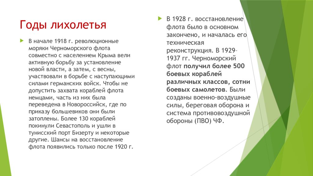 В начале 1918 г. революционные моряки Черноморского флота совместно с населением Крыма вели активную борьбу за установление новой власти, а затем, с весны, участвовали в борьбе с наступающими силами германских войск. Чтобы не допустить захвата кораблей флота немцами, часть из них была переведена в Новороссийск, где по приказу большевиков они были затоплены. Более 130 кораблей покинули Севастополь и ушли в тунисский порт Бизерту и некоторые другие. Шансы на восстановление флота появились только после 1920 г. В 1928 г. восстановление флота было в основном закончено, и началась его техническая реконструкция. В 1929–1937 гг. Черноморский флот получил более 500 боевых кораблей различных классов, сотни боевых самолетов. Были созданы военно-воздушные силы, береговая оборона и система противовоздушной обороны (ПВО) ЧФ.