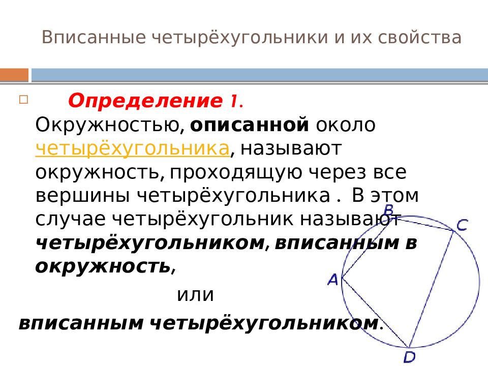 Определение 1. Окружностью, описанной около четырёхугольника, называют окружность, проходящую через все вершины четырёхугольника. В этом случае четырёхугольник называют четырёхугольником, вписанным в окружность, или вписанным четырёхугольником.