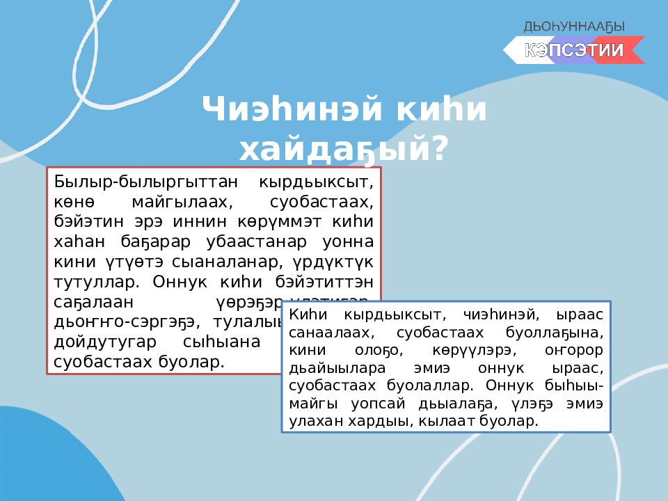 Былыр-былыргыттан кырдьыксыт, көнө майгылаах, суобастаах, бэйэтин эрэ иннин көрүммэт киһи хаһан баҕарар убаастанар уонна кини үтүөтэ сыаналанар, үрдүктүк тутуллар. Оннук киһи бэйэтиттэн саҕалаан үөрэҕэр-үлэтигэр, дьоҥҥо-сэргэҕэ, тулалыыр эйгэҕэ, дойдутугар сыһыана чиэһинэй, суобастаах буолар. Чиэһинэй киһи хайдаҕый ? Киһи кырдьыксыт, чиэһинэй, ыраас санаалаах, суобастаах буоллаҕына, кини олоҕо, көрүүлэрэ, оҥорор дьайыылара эмиэ оннук ыраас, суобастаах буолаллар. Оннук быһыы-майгы уопсай дьыалаҕа, үлэҕэ эмиэ улахан хардыы, кылаат буолар.