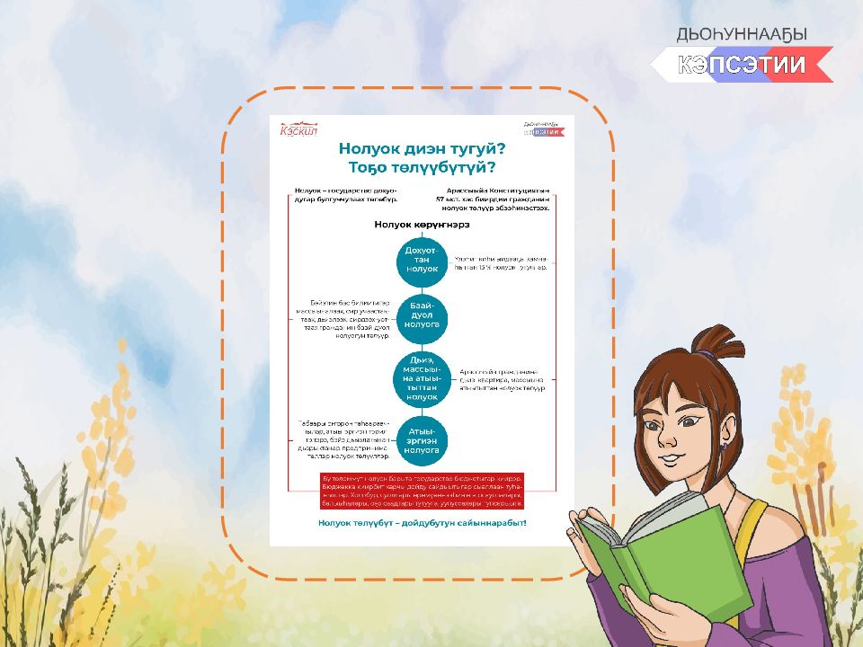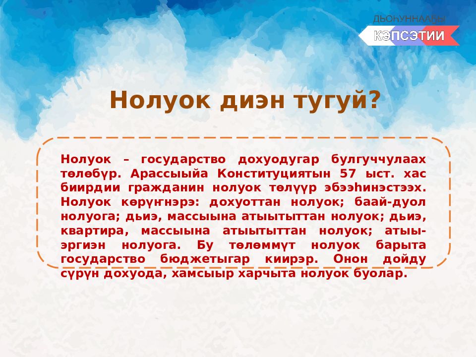 Нолуок – государство дохуодугар булгуччулаах төлөбүр. Арассыыйа Конституциятын 57 ыст. хас биирдии гражданин нолуок төлүүр эбээһинэстээх. Нолуок көрүҥнэрэ: дохуоттан нолуок; баай-дуол нолуога; дьиэ, массыына атыытыттан нолуок; дьиэ, квартира, массыына атыытыттан нолуок; атыы-эргиэн нолуога. Бу төлөммүт нолуок барыта государство бюджетыгар киирэр. Онон дойду сүрүн дохуода, хамсыыр харчыта нолуок буолар. Нолуок диэн тугуй ?