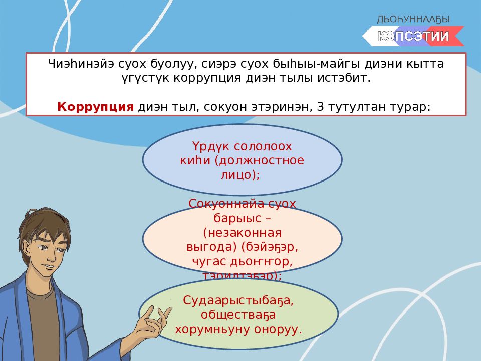 Чиэһинэйэ суох буолуу, сиэрэ суох быһыы-майгы диэни кытта үгүстүк коррупция диэн тылы истэбит. Коррупция диэн тыл, сокуон этэринэн, 3 тутултан турар : Үрдүк сололоох киһи (должностное лицо); Сокуоннайа суох барыыс – (незаконная выгода) (бэйэҕэр, чугас дьоҥҥор, тэрилтэҕэр); Судаарыстыбаҕа, обществаҕа хорумньуну оноруу.