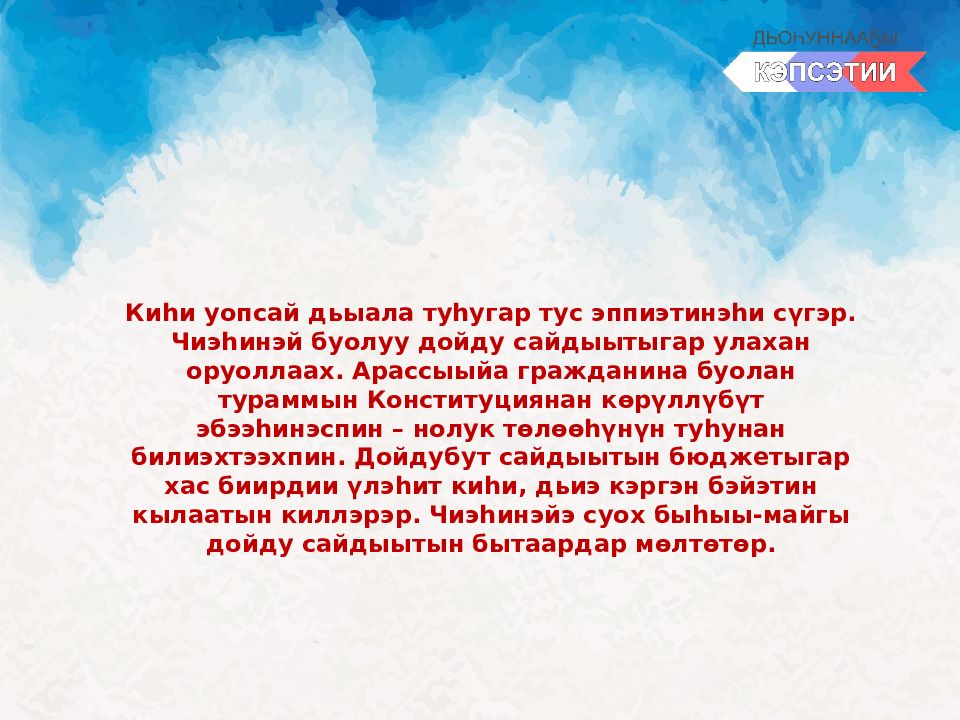 Киһи уопсай дьыала туһугар тус эппиэтинэһи сүгэр. Чиэһинэй буолуу дойду сайдыытыгар улахан оруоллаах. Арассыыйа гражданина буолан тураммын Конституциянан көрүллүбүт эбээһинэспин – нолук төлөөһүнүн туһунан билиэхтээхпин. Дойдубут сайдыытын бюджетыгар хас биирдии үлэһит киһи, дьиэ кэргэн бэйэтин кылаатын киллэрэр. Чиэһинэйэ суох быһыы-майгы дойду сайдыытын бытаардар мөлтөтөр.