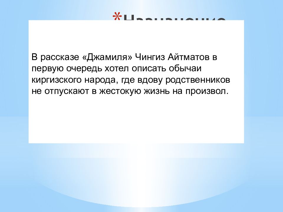 В рассказе «Джамиля» Чингиз Айтматов в первую очередь хотел описать обычаи киргизского народа, где вдову родственников не отпускают в жестокую жизнь на произвол.