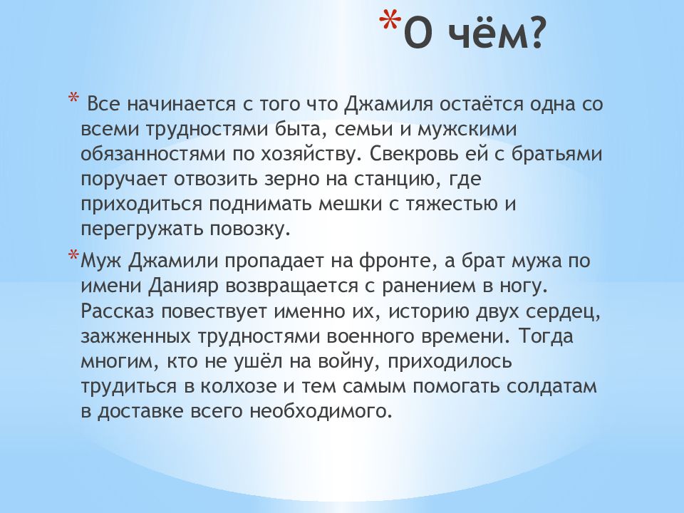 Все начинается с того что Джамиля остаётся одна со всеми трудностями быта, семьи и мужскими обязанностями по хозяйству. Свекровь ей с братьями поручает отвозить зерно на станцию, где приходиться поднимать мешки с тяжестью и перегружать повозку. Муж Джамили пропадает на фронте, а брат мужа по имени Данияр возвращается с ранением в ногу. Рассказ повествует именно их, историю двух сердец, зажженных трудностями военного времени. Тогда многим, кто не ушёл на войну, приходилось трудиться в колхозе и тем самым помогать солдатам в доставке всего необходимого.
