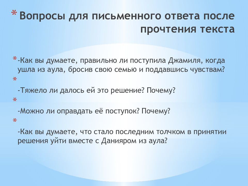 -Как вы думаете, правильно ли поступила Джамиля, когда ушла из аула, бросив свою семью и поддавшись чувствам? -Тяжело ли далось ей это решение ? Почему? -Можно ли оправдать её поступок ? Почему? -Как вы думаете, что стало последним толчком в принятии решения уйти вместе с Данияром из аула ?