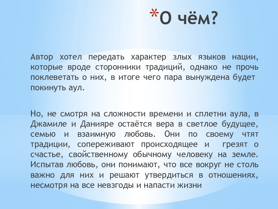 Автор хотел передать характер злых языков нации, которые вроде сторонники традиций, однако не прочь поклеветать о них, в итоге чего пара вынуждена будет покинуть аул. Но, не смотря на сложности времени и сплетни аула, в Джамиле и Данияре остаётся вера в светлое будущее, семью и взаимную любовь. Они по своему чтят традиции, сопереживают происходящее и грезят о счастье, свойственному обычному человеку на земле. Испытав любовь, они понимают, что все вокруг не столь важно для них и решают утвердиться в отношениях, несмотря на все невзгоды и напасти жизни