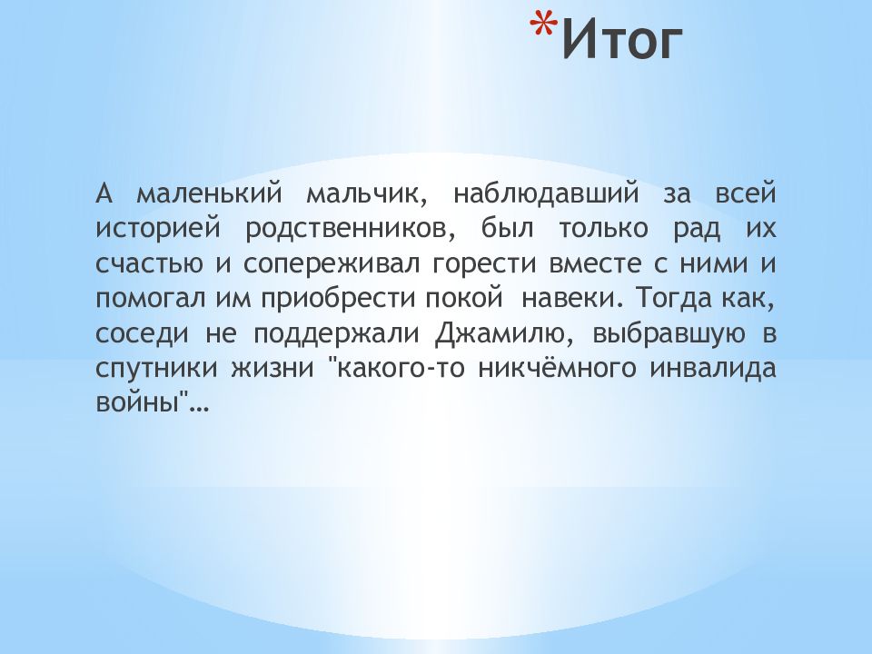 А маленький мальчик, наблюдавший за всей историей родственников, был только рад их счастью и сопереживал горести вместе с ними и помогал им приобрести покой навеки. Тогда как, соседи не поддержали Джамилю, выбравшую в спутники жизни "какого-то никчёмного инвалида войны"…
