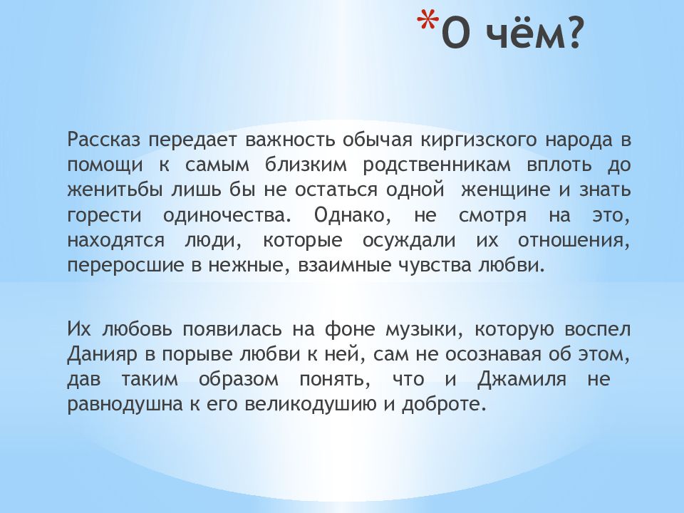 Рассказ передает важность обычая киргизского народа в помощи к самым близким родственникам вплоть до женитьбы лишь бы не остаться одной женщине и знать горести одиночества. Однако, не смотря на это, находятся люди, которые осуждали их отношения, переросшие в нежные, взаимные чувства любви. Их любовь появилась на фоне музыки, которую воспел Данияр в порыве любви к ней, сам не осознавая об этом, дав таким образом понять, что и Джамиля не равнодушна к его великодушию и доброте.