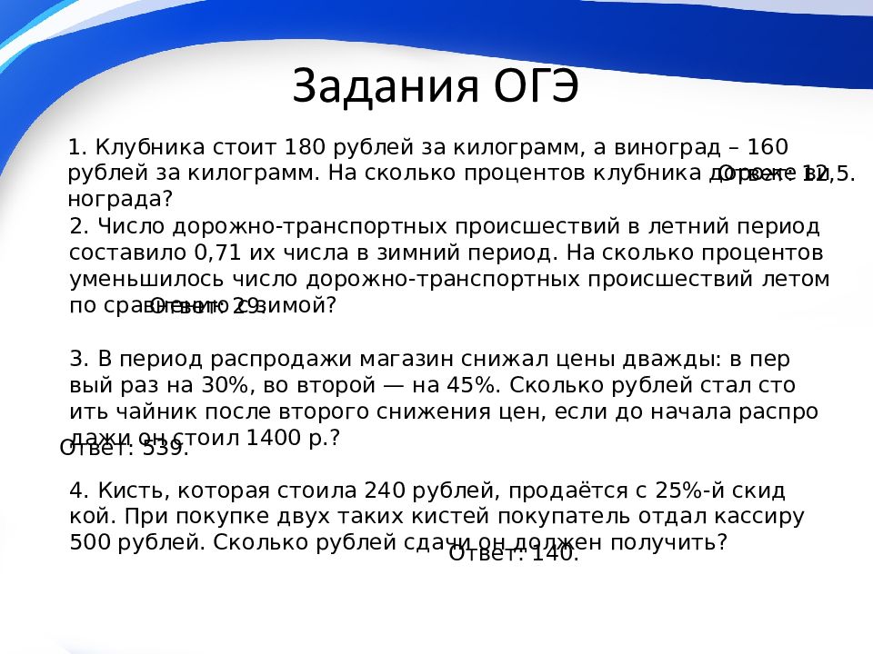 1. Клубника стоит 180 рублей за килограмм, а виноград – 160 рублей за килограмм. На сколько процентов клубника дороже винограда? Ответ: 12,5. 2. Число дорожно-транспортных происшествий в летний период составило 0,71 их числа в зимний период. На сколько процентов уменьшилось число дорожно-транспортных происшествий летом по сравнению с зимой? Ответ: 29. 3. В период распродажи магазин снижал цены дважды: в первый раз на 30%, во второй — на 45%. Сколько рублей стал стоить чайник после второго снижения цен, если до начала распродажи он стоил 1400 р.? Ответ: 539. 4. Кисть, которая стоила 240 рублей, продаётся с 25%-й скидкой. При покупке двух таких кистей покупатель отдал кассиру 500 рублей. Сколько рублей сдачи он должен получить? Ответ: 140.