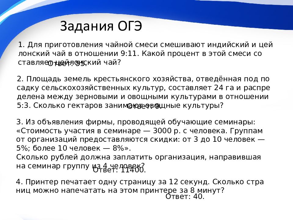 1. Для приготовления чайной смеси смешивают индийский и цейлонский чай в отношении 9:11. Какой процент в этой смеси составляет цейлонский чай ? 2. Площадь земель крестьянского хозяйства, отведённая под посадку сельскохозяйственных культур, составляет 24 га и распределена между зерновыми и овощными культурами в отношении 5:3. Сколько гектаров занимают овощные культуры? 3. Из объявления фирмы, проводящей обучающие семинары: «Стоимость участия в семинаре — 3000 р. с человека. Группам от организаций предоставляются скидки: от 3 до 10 человек — 5%; более 10 человек — 8%». Сколько рублей должна заплатить организация, направившая на семинар группу из 4 человек? 4. Принтер печатает одну страницу за 12 секунд. Сколько страниц можно напечатать на этом принтере за 8 минут? Ответ: 55. Ответ: 9. Ответ: 11400. Ответ: 40.