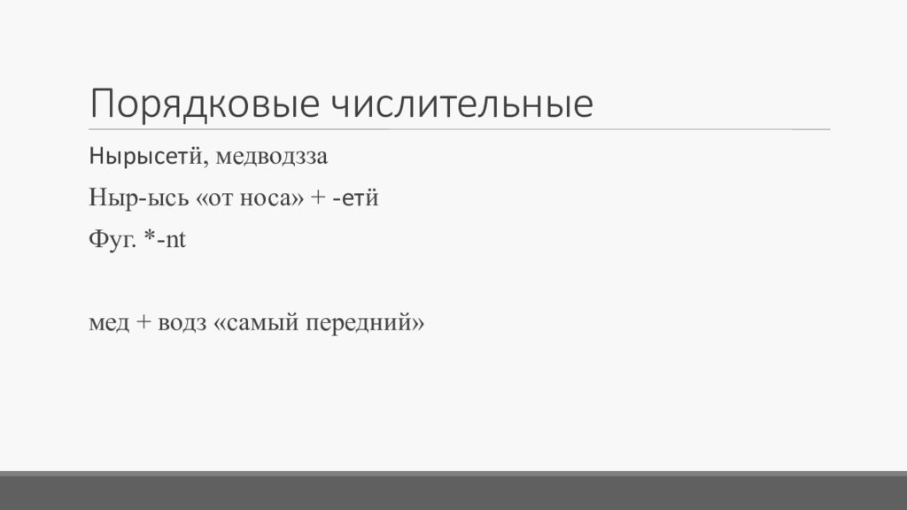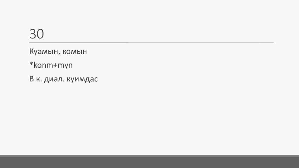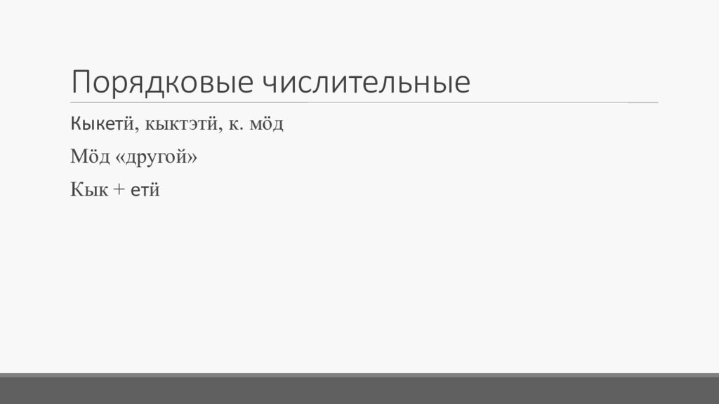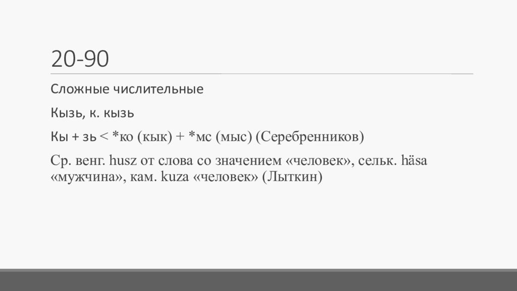 Сложные числительные Кызь, к. кызь Кы + зь ˂ *ко ( кык ) + *мс (мыс) (C еребренников ) Ср. венг. husz от слова со значением «человек», сельк. häsa «мужчина», кам. kuza «человек» (Лыткин)