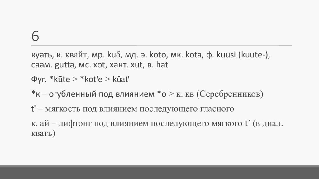 куать, к. квайт, мр. ku δ, мд. э. koto, мк. kota, ф. kuusi (kuute-), саам. gutta, мс. xot, хант. xut, в. hat Фуг. * k ū te > *kot ' e > k ŭat' *к – огубленный под влиянием *о > к. кв (Серебренников) t ' – мягкость под влиянием последующего гласного к. ай – дифтонг под влиянием последующего мягкого t ’ (в диал. квать )