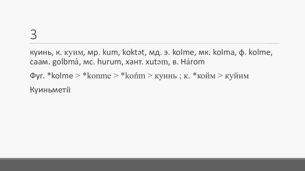 куинь, к. куим, мр. k um, kokt ә t, мд. э. kolme, мк. kolma, ф. kolme, саам. golbm â, мс. hurum, хант. xut ә m, в. H á rom Фуг. *kolme > * konme > * końm > куинь ; к. * койм > куйим Куиньмет ӥ