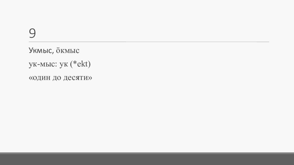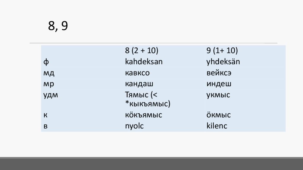 8 (2 + 10) 9 (1+ 10) ф kahdeksan yhdeksän мд кавксо вейксэ мр кандаш индеш удм Тямыс (< *кыкъямыс) укмыс к кöкъямыс öкмыс в nyolc kilenc