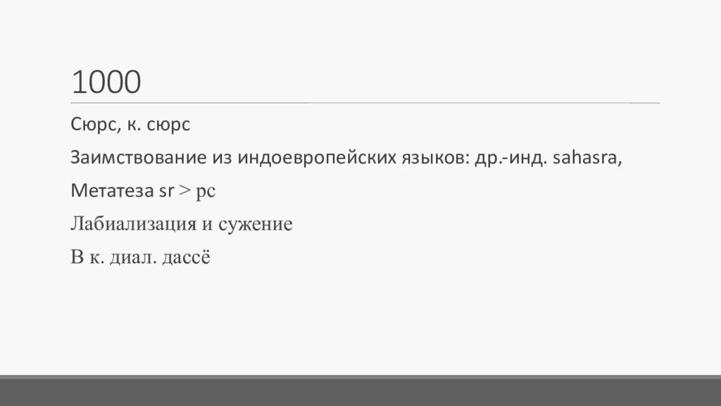 Сюрс, к. сюрс Заимствование из индоевропейских языков: др.-инд. sahasra, Метатеза sr > рс Лабиализация и сужение В к. диал. дассё
