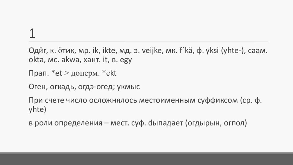 Од ӥ г, к. ӧ тик, мр. ik, ikte, мд. э. veijke, мк. f´k ä, ф. yksi (yhte-), саам. okta, мс. akwa, хант. it, в. egy Прап. *е t > доперм. *е kt Оген, огкадь, огдэ-огед ; укмыс При счете число осложнялось местоименным суффиксом (ср. ф. yhte ) в роли определения – мест. суф. d ыпадает ( огдырын, огпол )