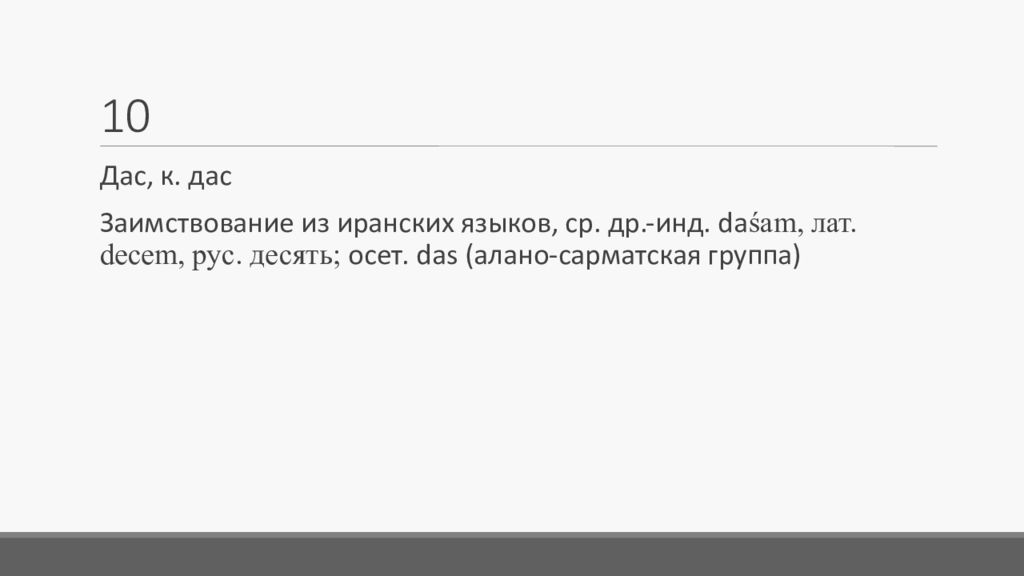 Дас, к. дас Заимствование из иранских языков, ср. др.-инд. da śam, лат. decem, рус. десять; осет. das (алано-сарматская группа)