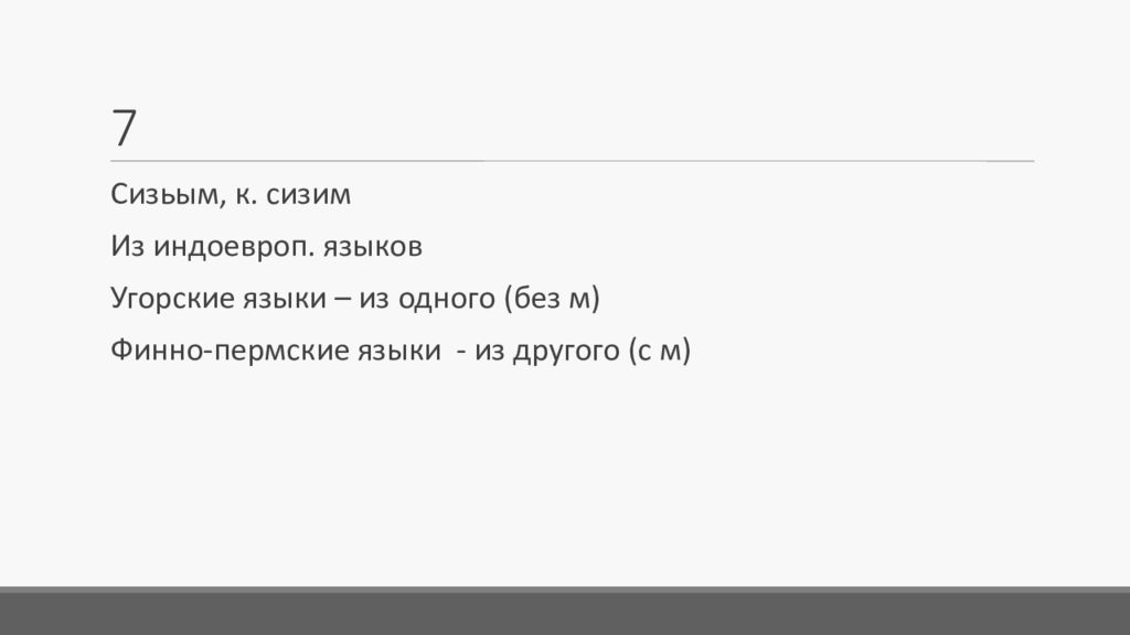 Сизьым, к. сизим Из индоевроп. языков Угорские языки – из одного (без м) Финно-пермские языки - из другого (с м)