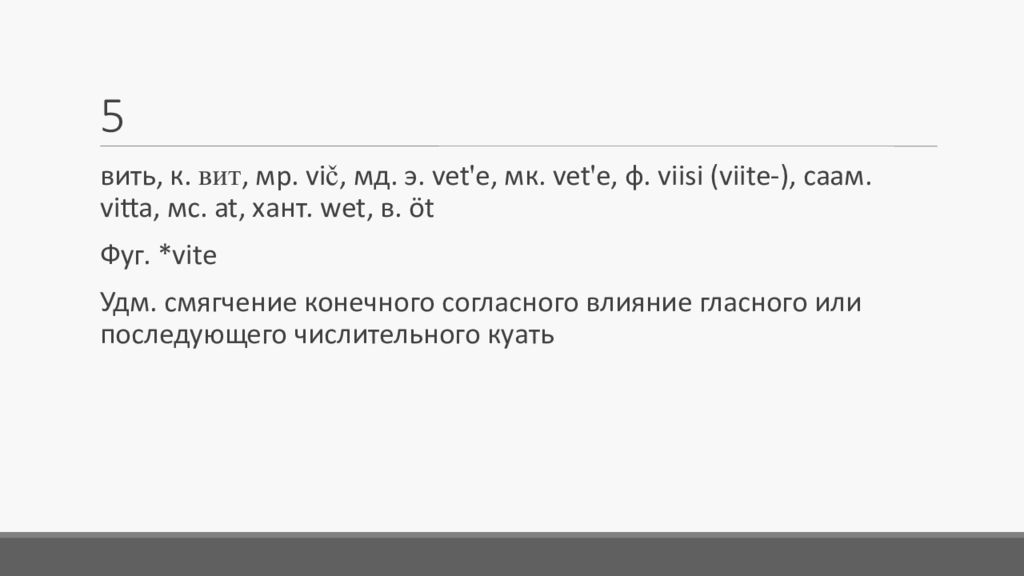 вить, к. вит, мр. vi č, мд. э. vet ' e, мк. vet ' e, ф. viisi (viite-), саам. vitta, мс. at, хант. wet, в. öt Фуг. *vite Удм. смягчение конечного согласного влияние гласного или последующего числительного куать