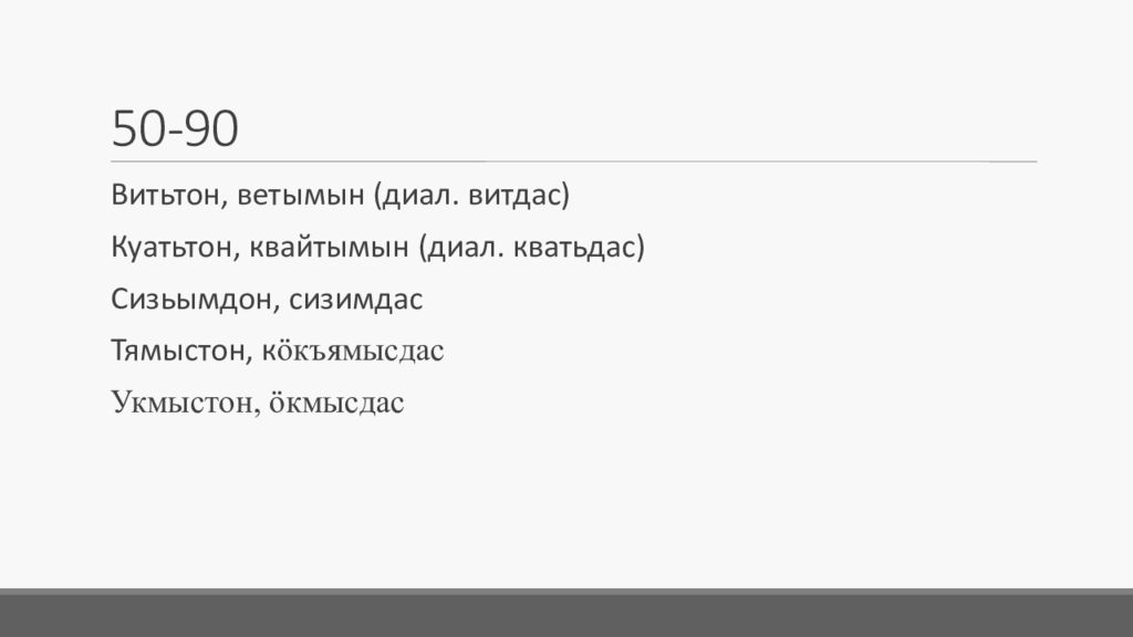 Витьтон, ветымын (диал. витдас ) Куатьтон, квайтымын (диал. кватьдас ) Сизьымдон, сизимдас Тямыстон, к ӧкъямысдас Укмыстон, ӧкмысдас