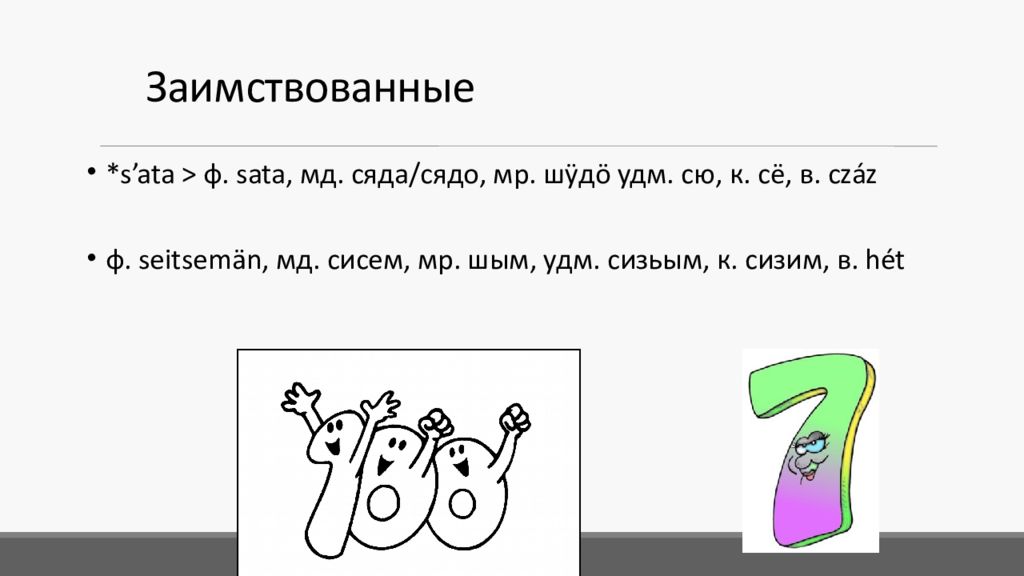 * s’ata > ф. sata, мд. сяда / сядо, мр. шÿдö удм. сю, к. сё, в. czáz ф. seitsemän, мд. сисем, мр. шым, удм. сизьым, к. сизим, в. hét