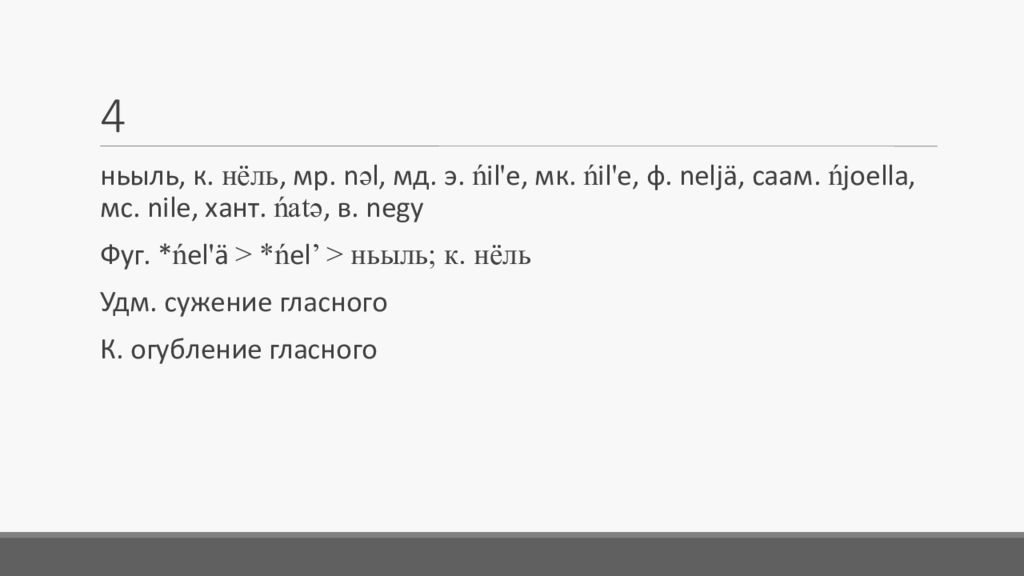 ньыль, к. нёль, мр. n ә l, мд. э. ń il ' e, мк. ń il ' e, ф. neljä, саам. ń joella, мс. nile, хант. ńat ә, в. negy Фуг. * ń el ' ä > * ń el ’ > ньыль ; к. нёль Удм. сужение гласного К. огубление гласного
