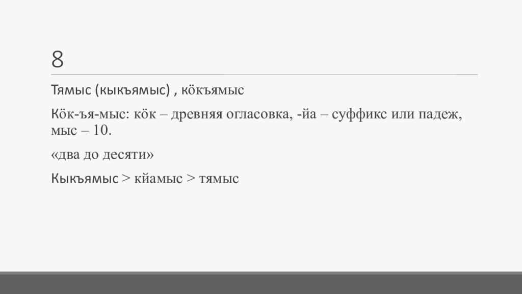 Тямыс ( кыкъямыс ), к ӧкъямыс К ӧк - ъя -мыс: кӧк – древняя огласовка, - йа – суффикс или падеж, мыс – 10. «два до десяти» Кыкъямыс > кйамыс > тямыс