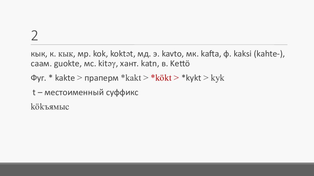 кык, к. кык, мр. kok, kokt ә t, мд. э. kavto, мк. kafta, ф. kaksi (kahte-), саам. guokte, мс. kit ә γ, хант. katn, в. Kettö Фуг. * kakte > праперм *kakt > *k ӧ kt > * kykt > kyk t – местоименный суффикс k ӧ k ъямыс