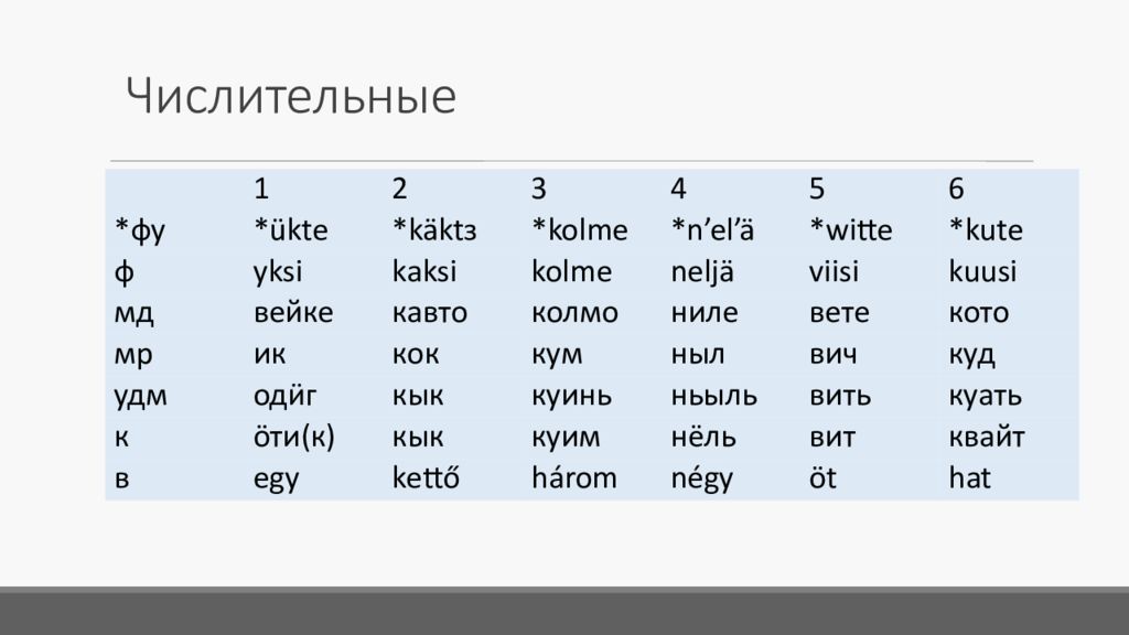1 2 3 4 5 6 *фу *ükte *käktз *kolme *n’el’ä *witte *kute ф yksi kaksi kolme neljä viisi kuusi мд вейке кавто колмо ниле вете кото мр ик кок кум ныл вич куд удм одӥг кык куинь ньыль вить куать к ӧти(к) кык куим нёль вит квайт в egy kettő három négy öt hat