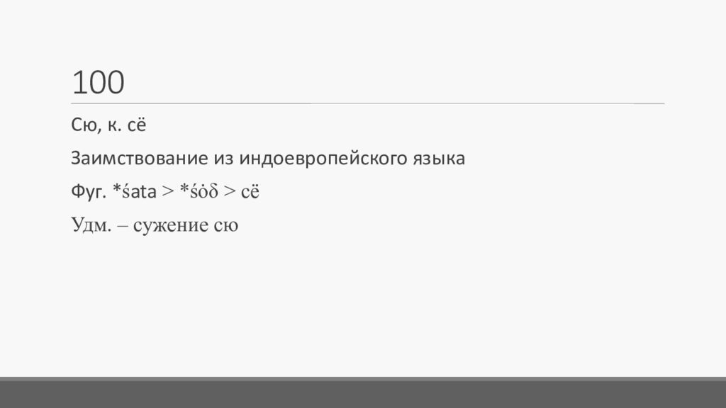 Сю, к. сё Заимствование из индоевропейского языка Фуг. * ś ata > * ś ȯ δ > сё Удм. – сужение сю