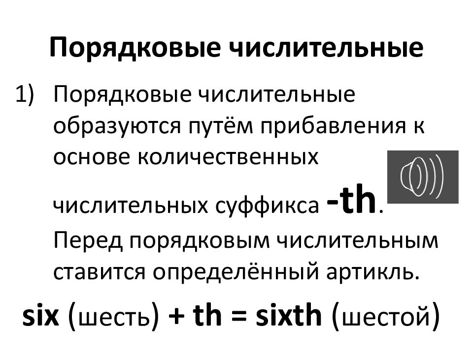 Порядковые числительные образуются путём прибавления к основе количественных числительных суффикса - th. Перед порядковым числительным ставится определённый артикль. six ( шесть ) + th = sixth ( шестой )