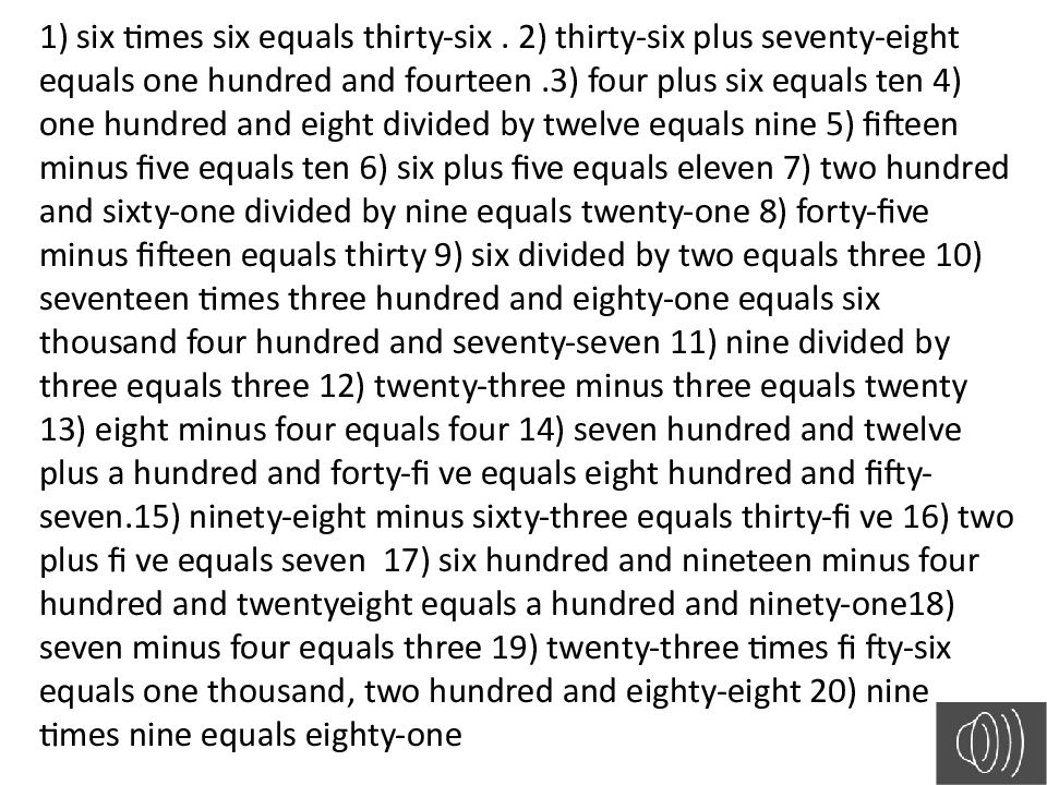 1) six times six equals thirty-six . 2) thirty-six plus seventy-eight equals one hundred and fourteen.3) four plus six equals ten 4) one hundred and eight divided by twelve equals nine 5) fifteen minus five equals ten 6) six plus five equals eleven 7) two hundred and sixty-one divided by nine equals twenty-one 8) forty-five minus fifteen equals thirty 9) six divided by two equals three 10) seventeen times three hundred and eighty-one equals six thousand four hundred and seventy-seven 11) nine divided by three equals three 12) twenty-three minus three equals twenty 13) eight minus four equals four 14) seven hundred and twelve plus a hundred and forty-fi ve equals eight hundred and fifty-seven.15) ninety-eight minus sixty-three equals thirty-fi ve 16) two plus fi ve equals seven 17) six hundred and nineteen minus four hundred and twentyeight equals a hundred and ninety-one18) seven minus four equals three 19) twenty-three times fi fty -six equals one thousand, two hundred and eighty-eight 20) nine times nine equals eighty-one