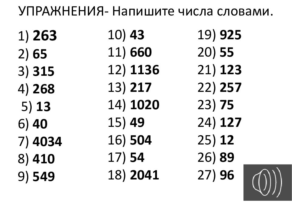 Слайд 23: УПРАЖНЕНИЯ - Напишите числа словами