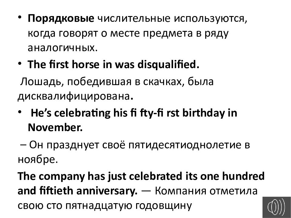 Порядковые числительные используются, когда говорят о месте предмета в ряду аналогичных. The first horse in was disqualified. Лошадь, победившая в скачках, была дисквалифицирована. He’s celebrating his fi fty -fi rst birthday in November. – Он празднует своё пятидесятиоднолетие в ноябре. The company has just celebrated its one hundred and fiftieth anniversary. — Компания отметила свою сто пятнадцатую годовщину