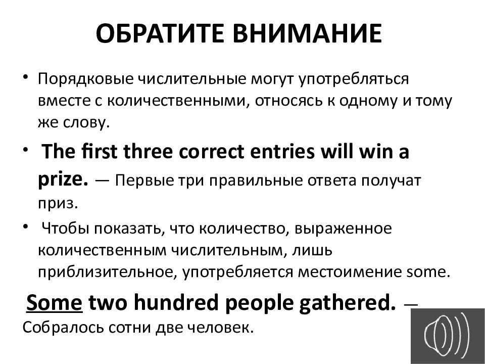 Порядковые числительные могут употребляться вместе с количественными, относясь к одному и тому же слову. The first three correct entries will win a prize. — Первые три правильные ответа получат приз. Чтобы показать, что количество, выраженное количественным числительным, лишь приблизительное, употребляется местоимение some. Some two hundred people gathered. — Собралось сотни две человек.
