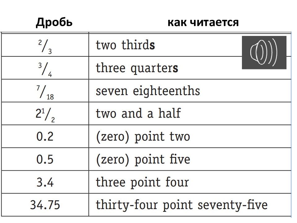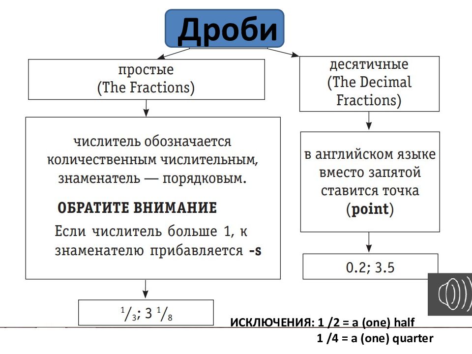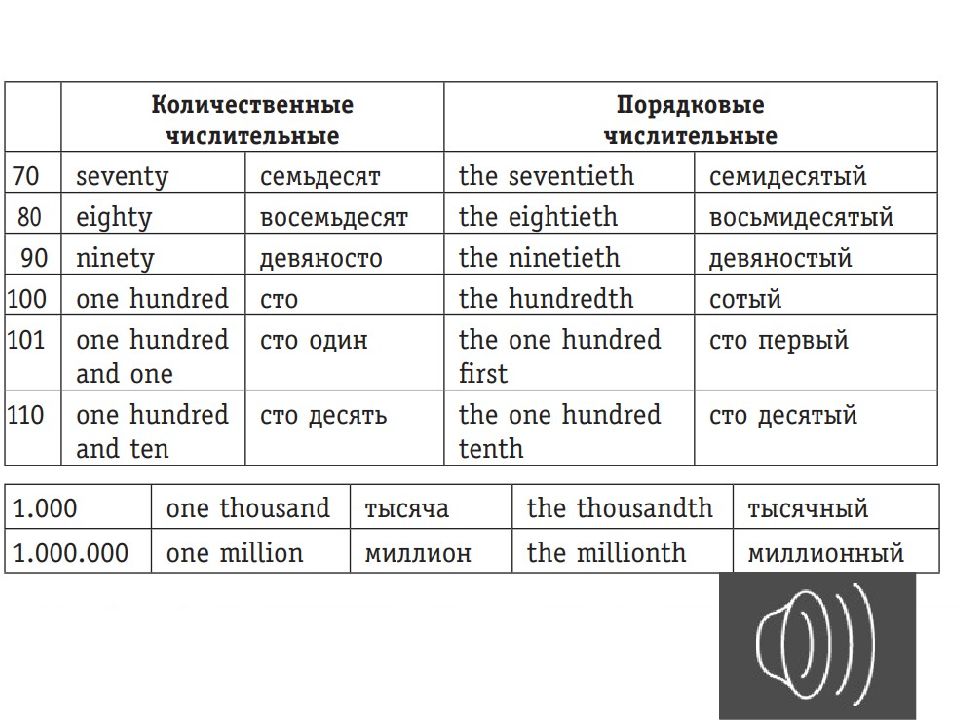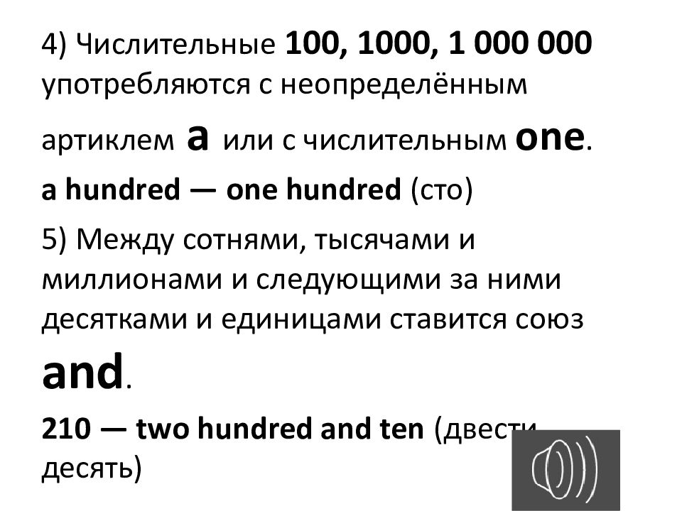 4) Числительные 100, 1000, 1 000 000 употребляются с неопределённым артиклем a или с числительным one. a hundred — one hundred (сто) 5) Между сотнями, тысячами и миллионами и следующими за ними десятками и единицами ставится союз and. 210 — two hundred and ten (двести десять)