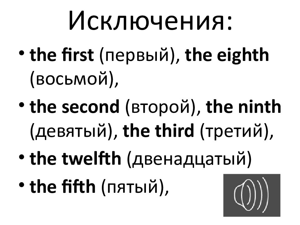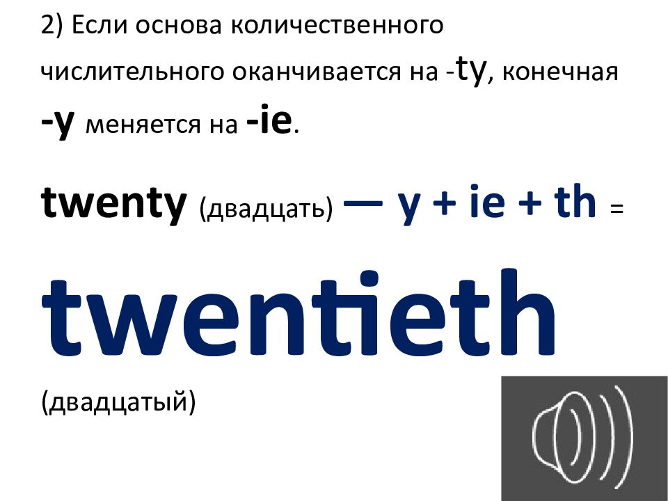 2) Если основа количественного числительного оканчивается на - ty, конечная -y меняется на - ie. twenty (двадцать) — y + ie + th = twentieth (двадцатый)